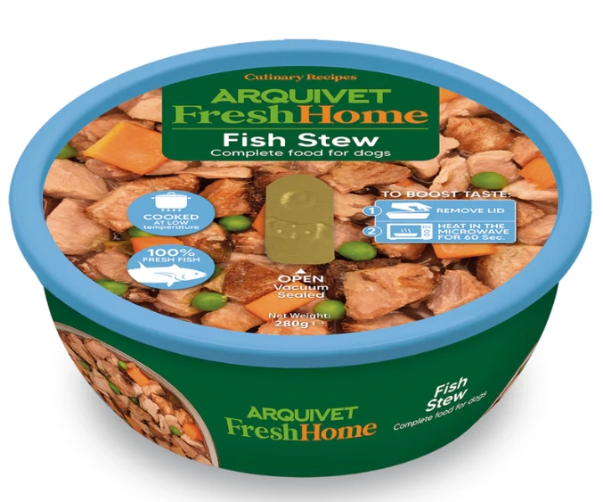 Ragoût de poisson. Composition : 97 % de thon frais en sauce, carottes, petits pois, potiron, épices. Additifs nutritionnels : Vitamines (UI/kg) : Vitamine A (3a672a) 8011, Vitamine D3 (3a671) 513, Vitamine E (3a700) 160. Minéraux : 3b503 (Mn : 3,2), 3b103 (Fe : 32), 3b405 (Cu : 4,3), 3b603 (Zn : 35), 3b201 (I : 0,5). Composants analytique : Protéines brutes : 19,8 %, Matières grasses brutes : 0,9 %, Fibres brutes : 1,4 %, Cendres brutes : 0,7 %, Humidité : 76,7 %. Énergie métabolisable/kg : 893 kcal – 3 736 kJ.